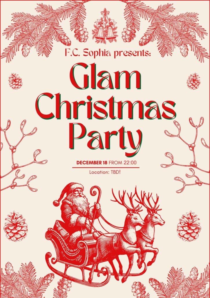 Luckily we will deliver on something very fun! 🕺 This December, F.C. Sophia will organise another big party again! It will be not just a Christmas party, but a Glam Christmas party of all things! 🪩🧑‍🎄 So if you’re feeling fancy or just want to flee the boring Christmas dinner, be there on the 18th of December from 22:00 onwards!! The location is yet to be revealed… 😺